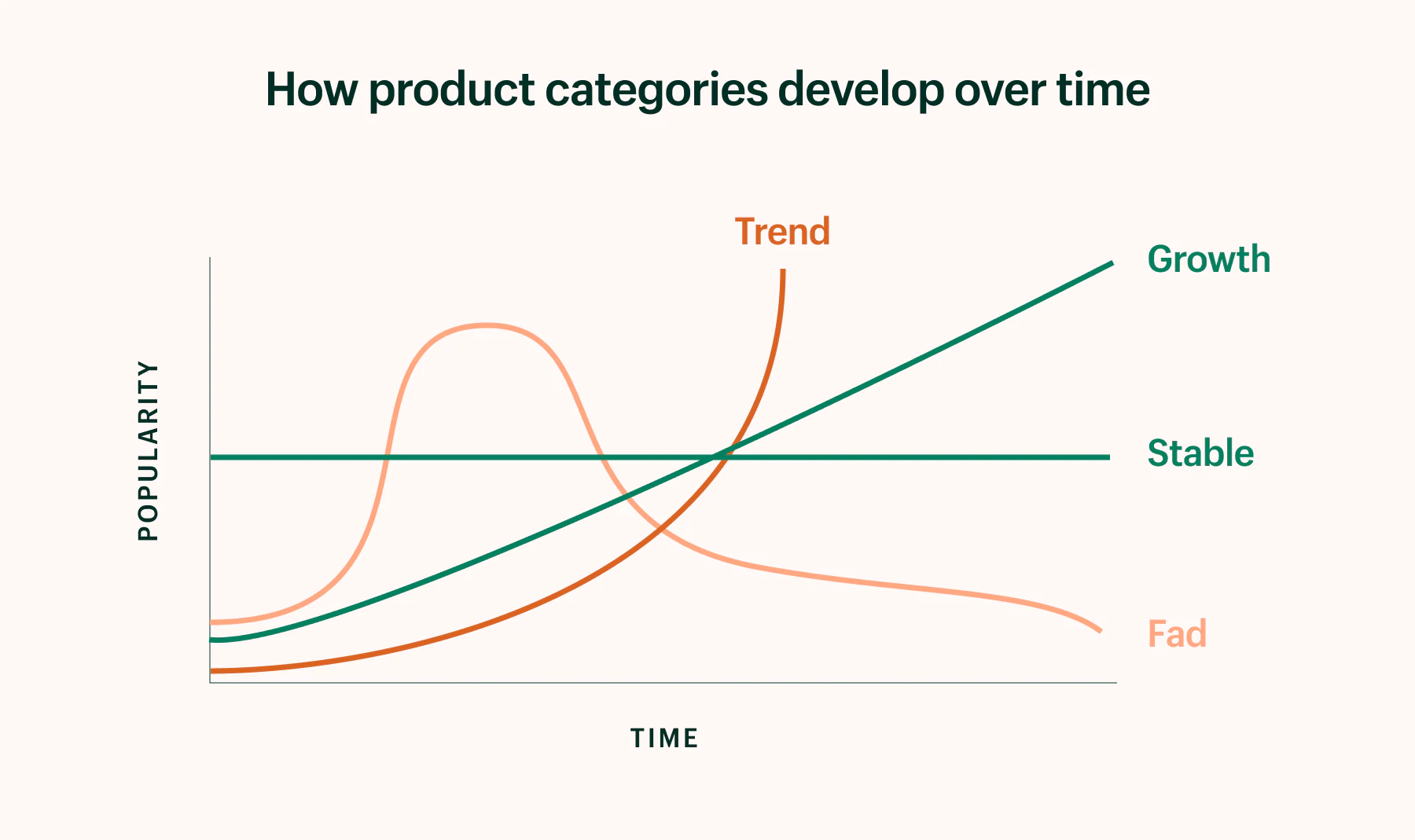 추세는 제품 시장이 취하는 것으로 보이는 장기적인 방향입니다. 그것은 유행만큼 빨리 성장하지 않고 더 오래 지속되며 일반적으로 거의 빠르게 감소하지 않습니다. 트렌드 제품은 때때로 예측하기 어려울 수 있지만 장기적으로 성장하는 시장으로 발전할 수도 있습니다.