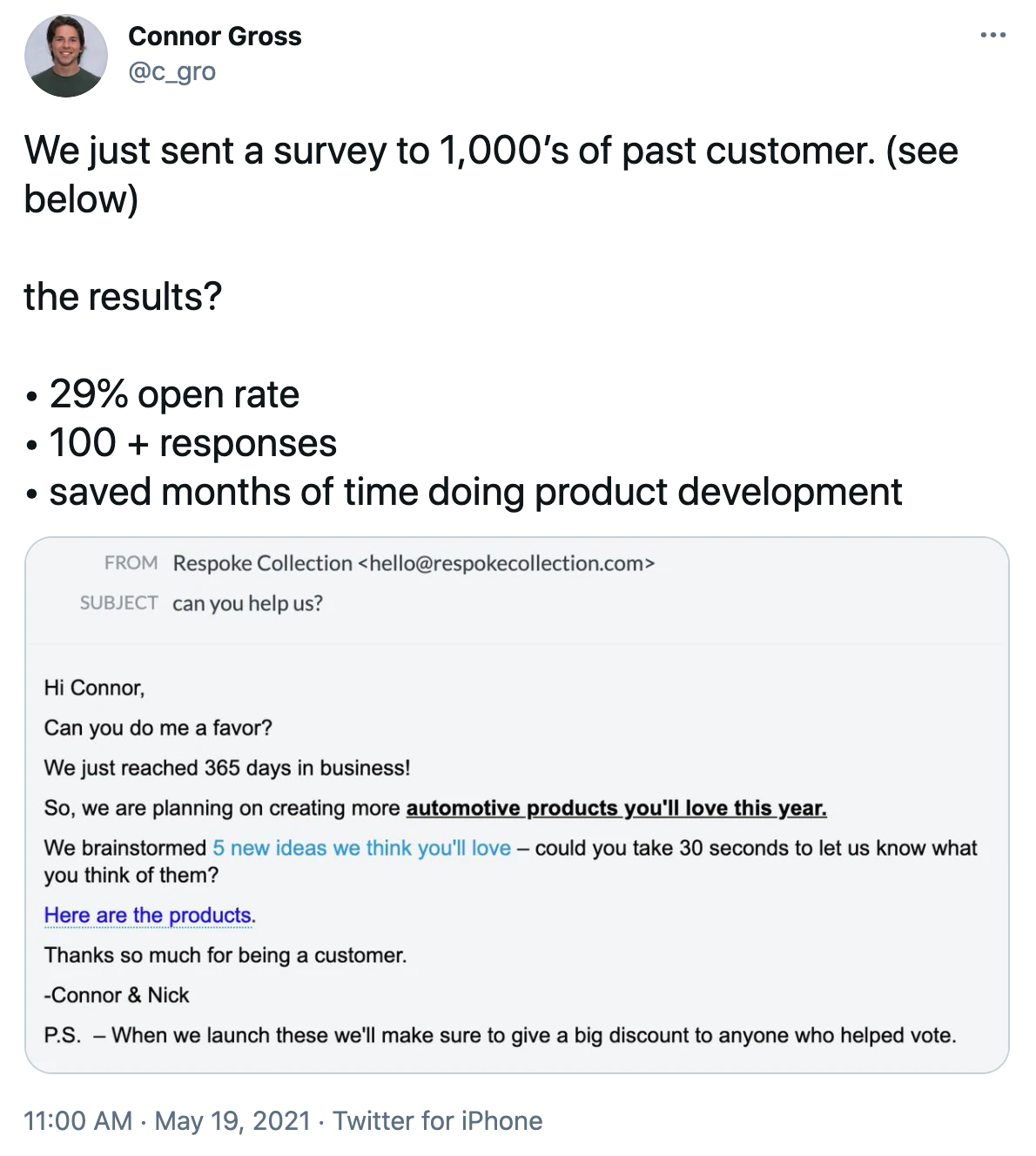 고객이 500명이든 500명이든 관계없이 제품 아이디어를 얻는 가장 좋은 방법 중 하나는 고객으로부터 얻는 것입니다. 고객 기반에 이메일을 보내고 염두에 둔 몇 가지 제품 아이디어에 대한 피드백을 요청할 수 있습니다.