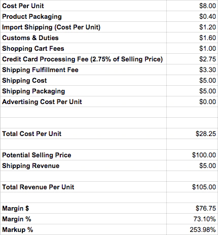 위의 예에서 작은 수수료가 마진에서 어떻게 줄어들는지 알 수 있습니다. 이 경우 초기 마크업이 1,200%를 넘던 제품이 모든 것을 말했을 때 마크업은 100% 미만으로 끝납니다.
