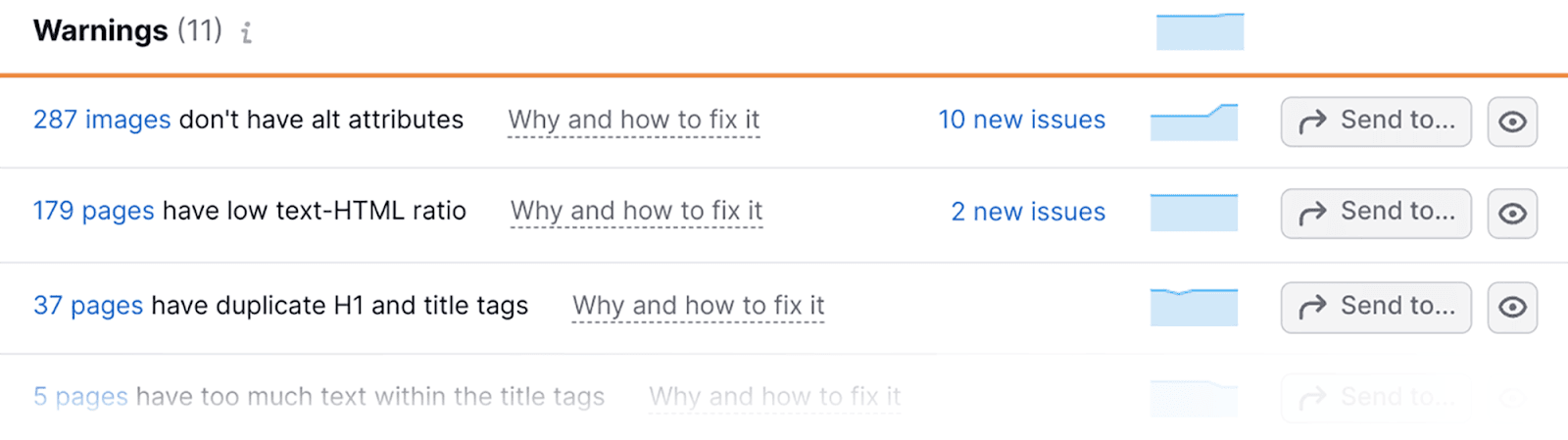 그래도 걱정하지 마세요! Semrush의 사이트 감사 도구로 이동하여 "경고" 섹션을 방문하십시오. 검색창에 "alt"를 입력하세요. 여기에서 누락된 Alt 속성을 검토할 수 있습니다.