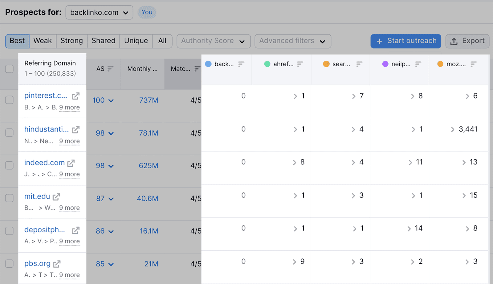 경쟁업체에 연결되는 웹사이트를 수동으로 검색하는 대신 Backlink Gap 도구는 잠재적으로 백링크를 얻을 수 있는 도메인 목록을 제공합니다.