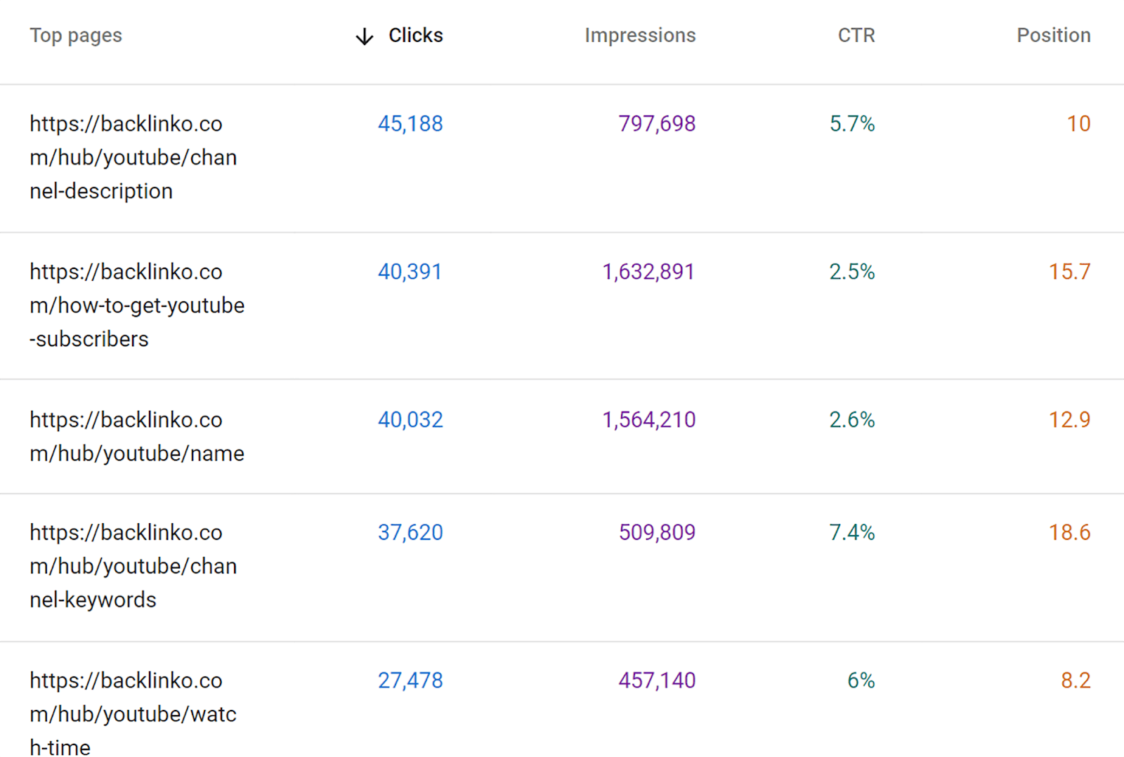 보시다시피, GSC를 사용하면 페이지에서 발생하는 클릭수와 노출수, CTR 및 평균 게재순위를 파악해야 하는 수고를 덜 수 있습니다.