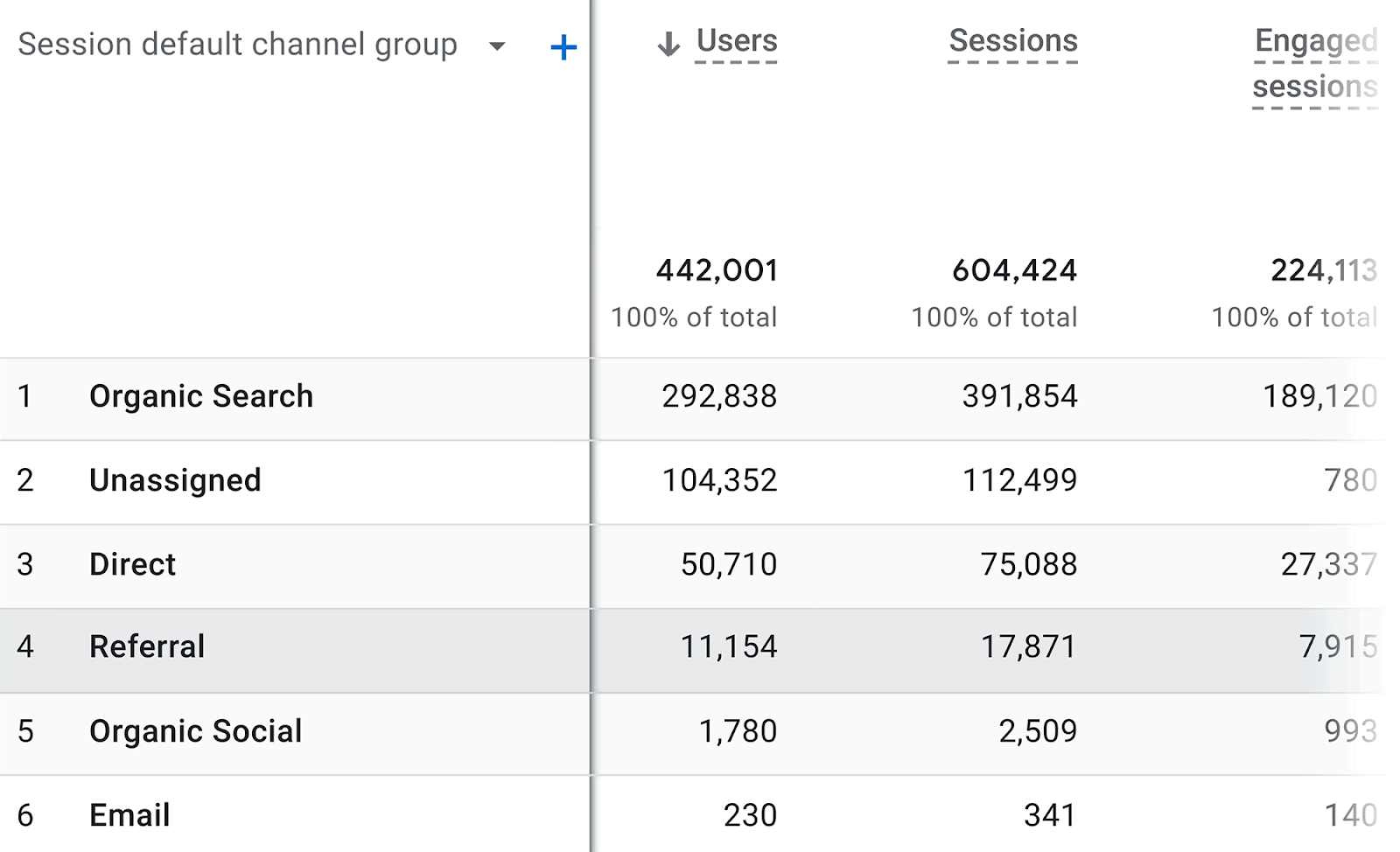 예를 들어 내 사이트를 방문한 442,001명의 사용자 중 292,838명이 자연 검색을 통해 방문했다는 것을 알 수 있습니다.