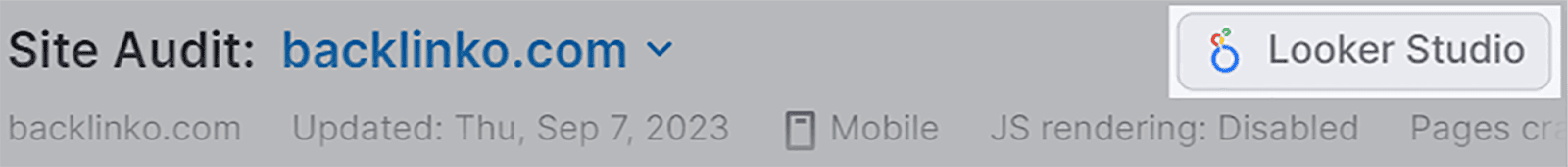 Semrush Guru 계정이 있는 경우 페이지 오른쪽 상단에 있는 버튼을 클릭하여 Semrush 데이터를 Looker Studio로 내보낼 수도 있습니다. 내보낼 수 있는 두 가지 보고서는 직위 추적과 사이트 감사입니다.
