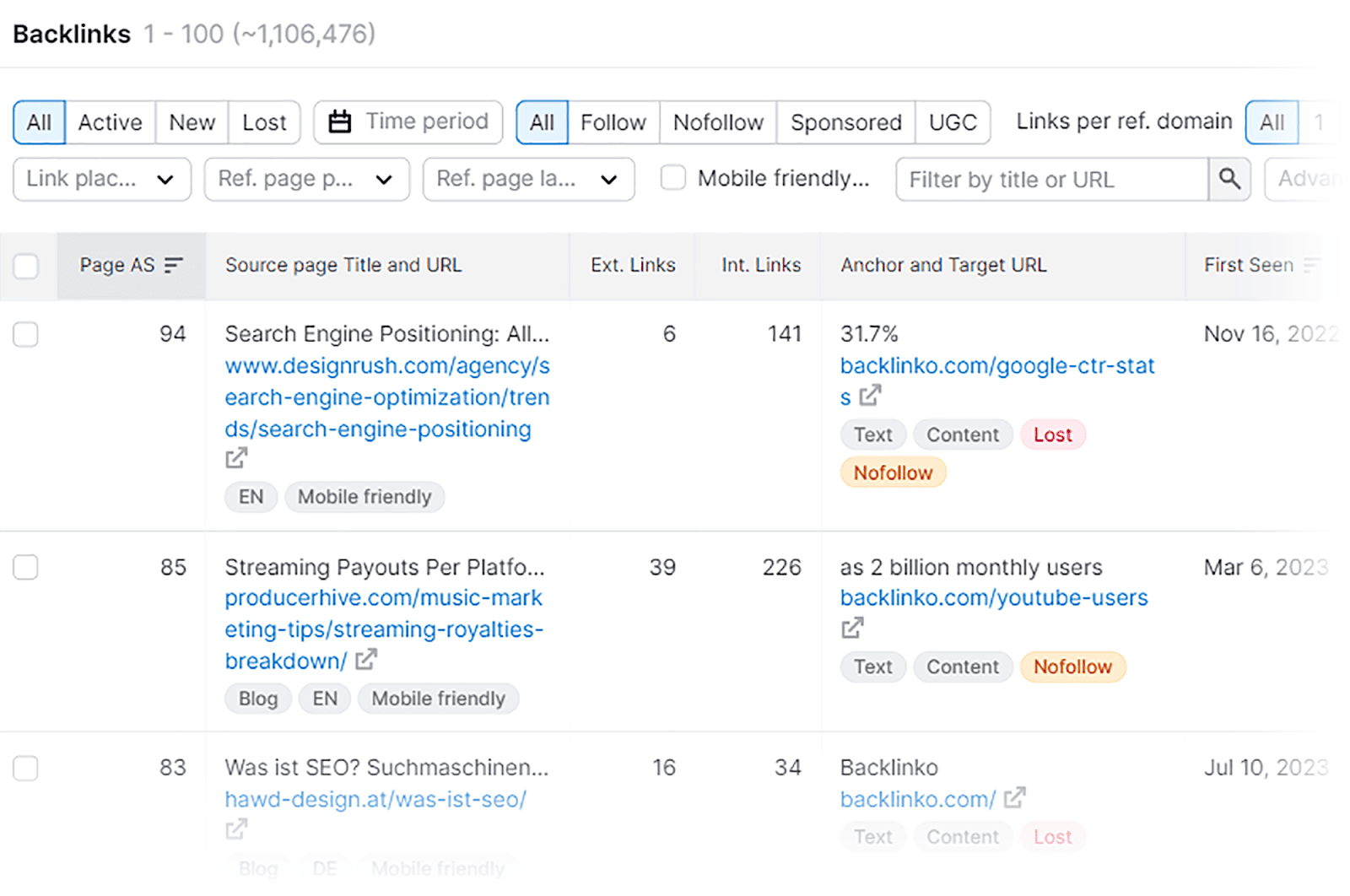 이러한 URL 중 하나를 클릭하면 페이지에서 수신하는 모든 백링크를 검토할 수 있습니다.