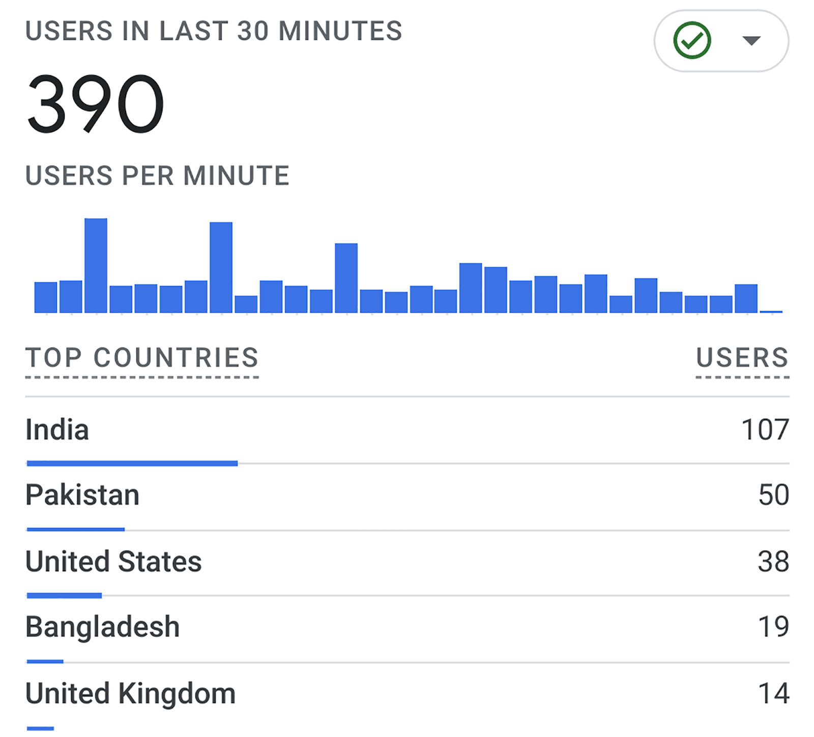 오른쪽에서는 지난 30분 동안 귀하의 사이트를 방문한 총 사용자 수와 이들이 방문한 국가를 검토할 수도 있습니다.