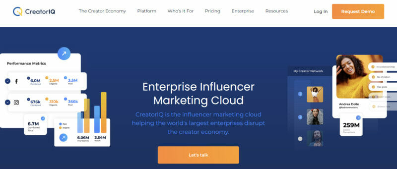 2014년에 설립된 CreatorIQ는 글로벌 인플루언서 마케팅 소프트웨어입니다. 데이터베이스에 2천만 명이 넘는 크리에이터가 있습니다. 인플루언서 마케팅 도구 범위는 다양한 브랜드와 산업 유형 및 규모에 적합합니다. 인플루언서 여정을 성장 및 관리할 수 있을 뿐만 아니라 통합 및 사용자 정의를 통해 프로그램을 확장할 수 있습니다.