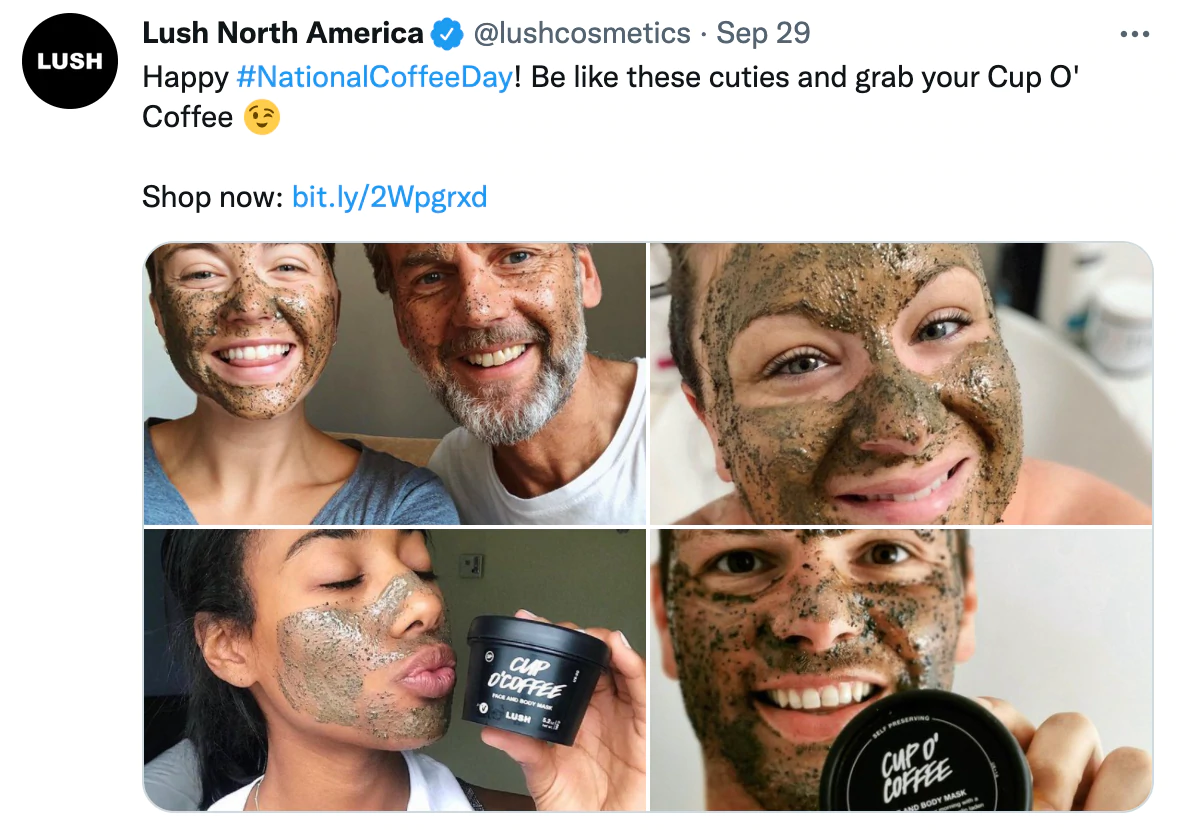 소셜 미디어의 어느 주어진 날에는 표시할 수 있는 일종의 기회가 있습니다. #NationalCoffeeDay를 위해 Lush는 Twitter에서 사진과 Cup O' Coffee 마스크 링크를 공유했습니다. 이것은 트렌드 해시를 마케팅에 통합하고 추진력을 얻는 재미있는 방법입니다. 도넛 모양의 비누가 있습니까? National Donut Day는 6월입니다. 천연 제품을 사용합니까? National Clean Beauty Day는 7월입니다. 더 많은 국경일을 계획하려면 이 웹사이트를 확인하십시오.