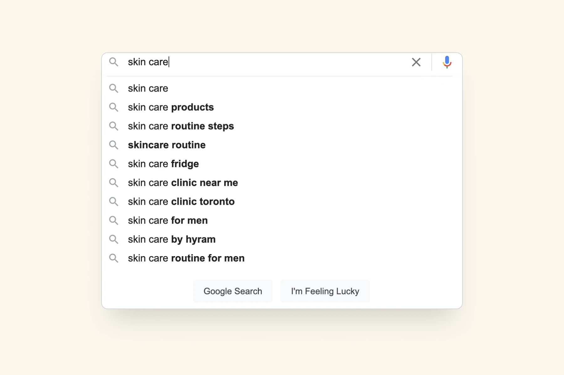 가장 먼저 고려해야 할 것은 고객을 사이트로 유도할 검색어가 무엇인지입니다. Google 검색창에 "skin care"를 입력하기 시작하면 이미 인기 있는 검색어가 무엇인지 볼 수 있습니다.