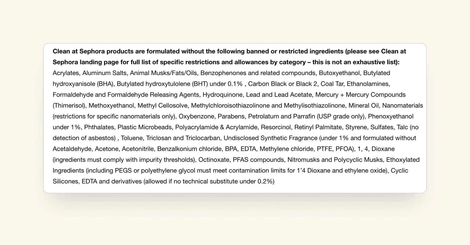 포함 하지 않은 성분을 강조 표시할 수도 있습니다. 예를 들어 Sephora의 웹사이트에는 제품 설명에 성분 설명 섹션이 있습니다. 제품에 프탈레이트(플라스틱에 사용됨), 파라벤(방부제), 황산염(헤어 케어 제품에서 흔히 발견됨)과 같은 논란의 여지가 있는 성분이 있는지 여부를 확인하는 데 사용합니다. 이러한 성분을 피하는 제품을 찾는 분들에게 유용한 정보입니다. 이 매장은 또한 논란의 여지가 있는 성분 목록이 없는 제품에 대해 Clean at Sephora 지정을 받았습니다.