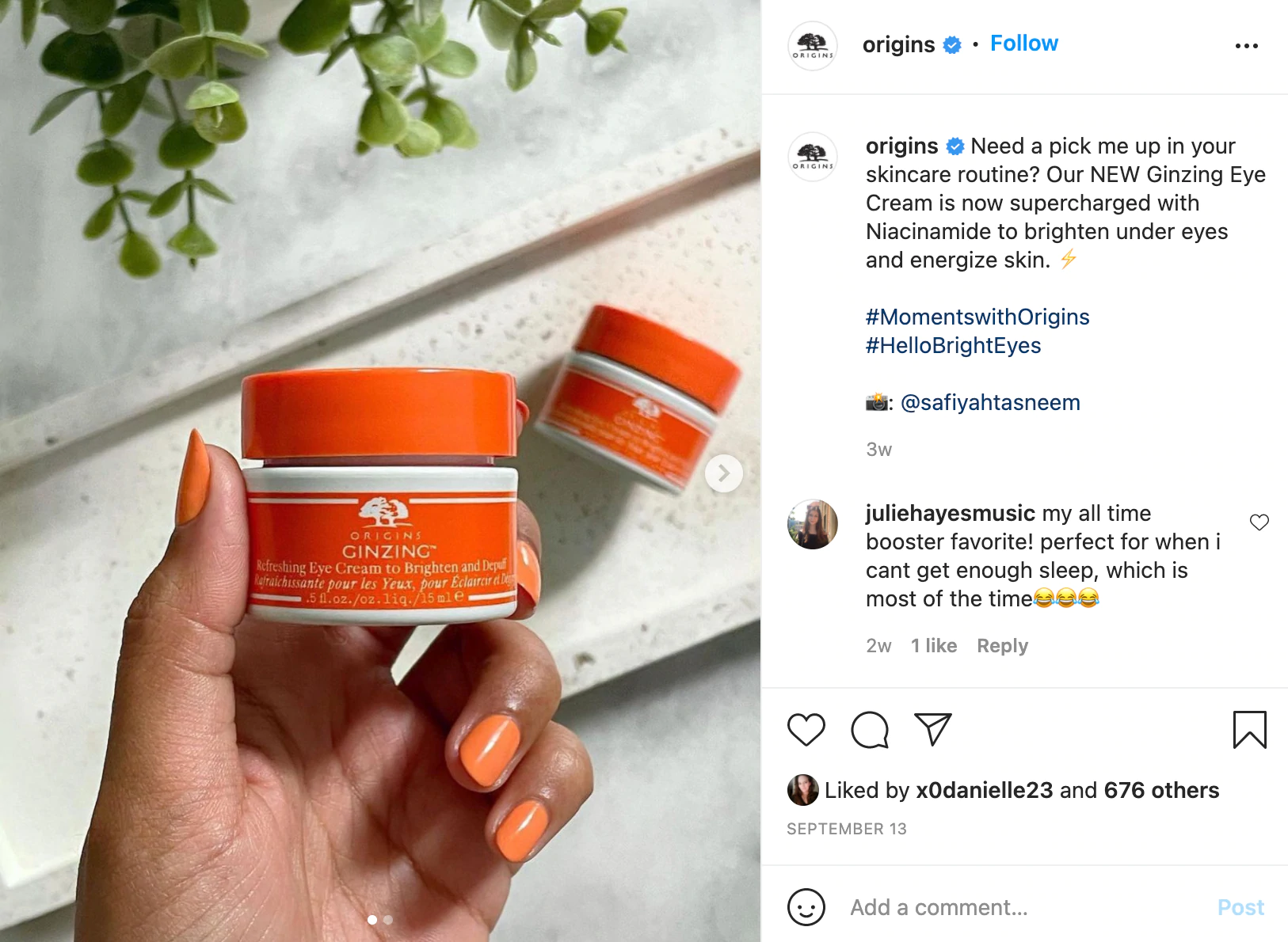 귀하의 고객이 소셜 미디어에서 귀하를 찾으면 귀하의 제품에 대해 게시하는 사람들이 스스로 태그를 지정하는 것을 발견할 수 있습니다. 이것은 매우 타당하고 흥미롭게 볼 수 있습니다. 예를 들어 Instagram에서 이러한 일이 발생하면 스토리에 쉽게 다시 게시할 수 있습니다. 그렇지 않으면 가장 좋은 에티켓은 연락하여 다시 게시할 수 있는 권한을 요청하고 게시물을 다시 업로드하는 경우 항상 고객에게 크레딧을 제공하는 것입니다. 사용자에게 할인 코드를 제공하여 고객 게시물을 장려할 수도 있습니다. 이 콘텐츠를 진행하는 또 다른 방법은 인플루언서와 계약하거나 무료 제품을 보내는 것입니다. 다음은 인스타그램에 있는 Origins의 게시물로, 뷰티 인플루언서 Safiyah Tasneem이 무료 제품을 받은 후 올린 이미지를 다시 게시했습니다. 확립된 인플루언서의 게시물의 보너스는 여기와 같이 세련되고 전문적이라는 것입니다. 여기에서 Tasneem은 제품에 손톱을 매치했습니다.