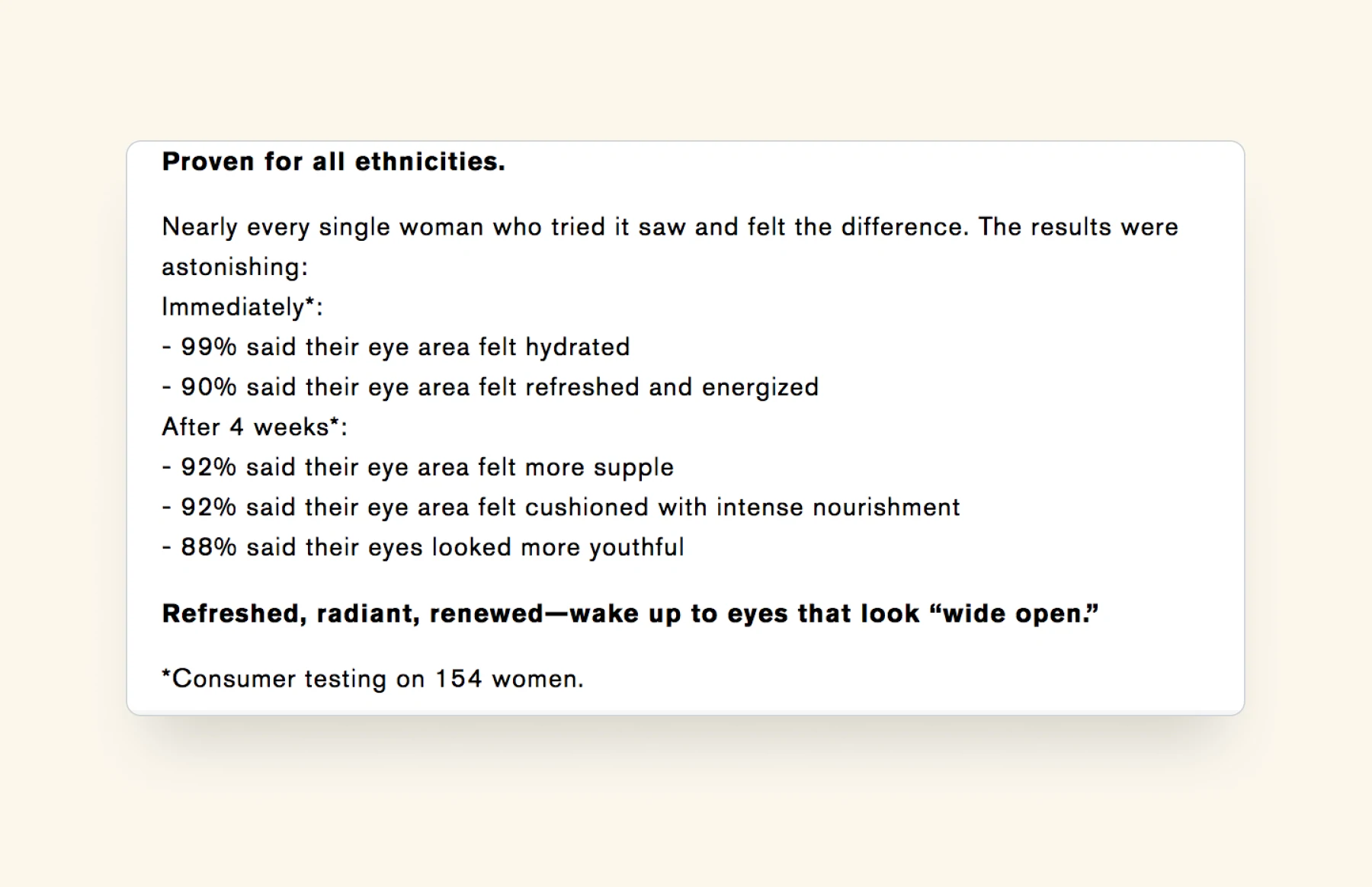 이 사본의 어떤 것도 실제로 고객에게 마스크가 무엇을 하는지 알려주지 않습니다. 그것은 "젊은 수분"을 약속하지만 그것이 단지 모이스처 라이저라는 의미입니까 아니면 잔주름과 주름을 해결한다는 의미입니까? "수분을 잠그는 데 도움"이 나이트 크림을 대체한다는 것을 의미합니까? "신선한" 또는 "갱신된"과 같은 단어는 좋게 들리지만 모호합니다.