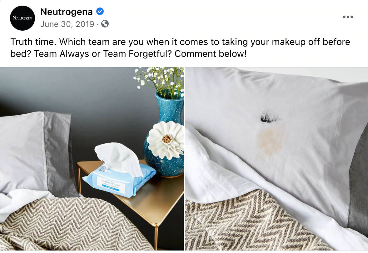 무엇을 게시해야 할지 막막하다면 질문을 게시하는 것만으로도 효과가 있을 수 있습니다. 많은 플랫폼에는 투표 옵션이 내장되어 있거나 단순히 사람들이 댓글에 답하도록 할 수 있습니다. 이것은 사람들이 귀하의 게시물과 상호 작용하도록 장려하여 참여를 유도합니다. 다음은 Neutrogena가 Facebook에 사람들이 자기 전에 화장을 지우는 것을 기억하는지 묻는 간단한 질문을 게시한 예입니다. 이는 메이크업 제거 물티슈와 완벽하게 연결됩니다.