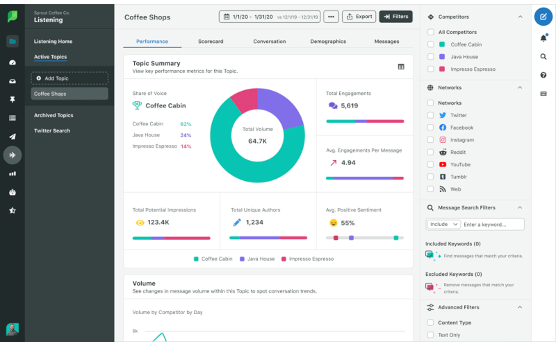 Sprout은 하나의 대시보드에서 다양한 소셜 미디어 계정을 관리하는 데 도움이 되는 강력한 소셜 청취 도구입니다.