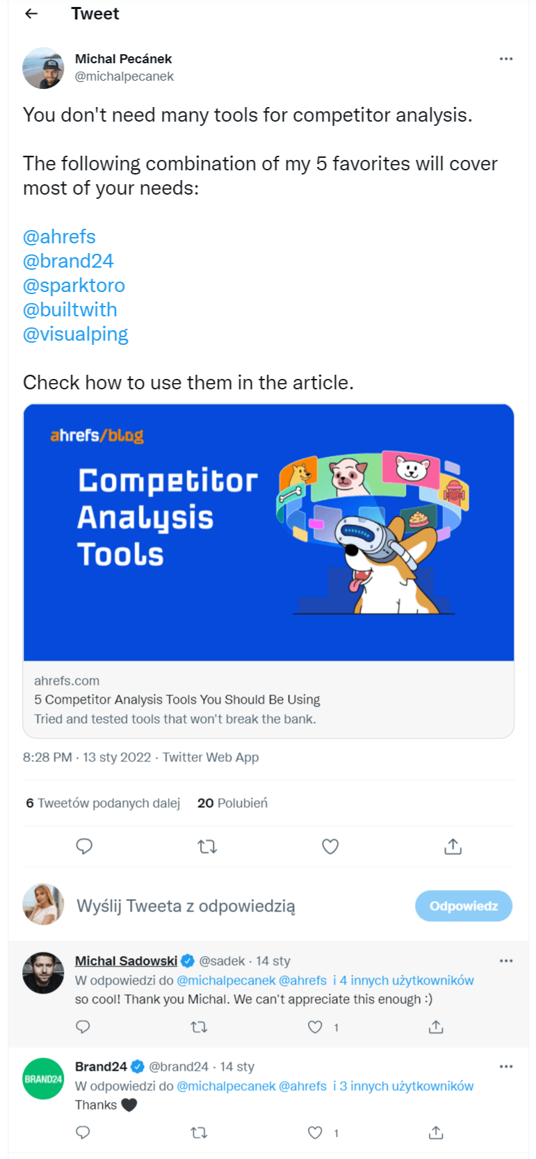 다음은 파트너와 강력한 관계를 구축할 수 있는 방법의 예입니다. 얼마 전 Ahrefs의 SEO 및 마케팅 교육자 Michal이 Twitter에서 Brand24를 언급했습니다. 우리 CEO는 그의 게시물에 반응할 수 있었습니다. 이는 다른 회사와 관계를 구축하는 좋은 방법입니다.