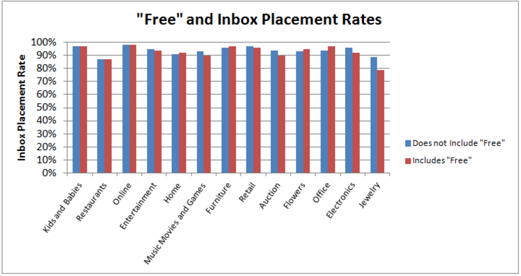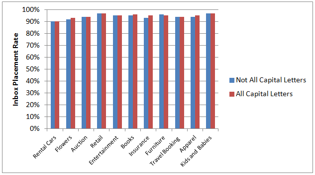 증거는 여기서 끝나지 않습니다. 일부 흥미로운 연구에 따르면 여러 부문에서 고위험 스팸 항목 (예: 단어가 없는 단어 또는 대문자로 된 전체 단어)을 포함하는 제목 줄은 "깨끗한" 제목이 포함된 이메일과 실질적으로 동일한 전송률을 나타 냅니다. 규칙이 위반될 때까지 적용된다는 증거.