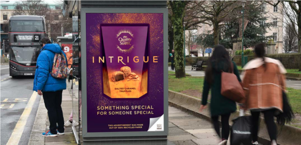 한 가지 빛나는 예는 옥외(OOH) 6포스터 광고 활동에 100% 재활용 종이와 친환경 인쇄 기술을 사용한 영국 최초의 브랜드가 된 Nestle에서 나옵니다. 버스 정류소 광고(아래) 중 하나의 사진을 자세히 보면 네슬레가 포스터에서 100% 재활용 가능한 재료로 인쇄했다고 언급하는 것을 알 수 있습니다.