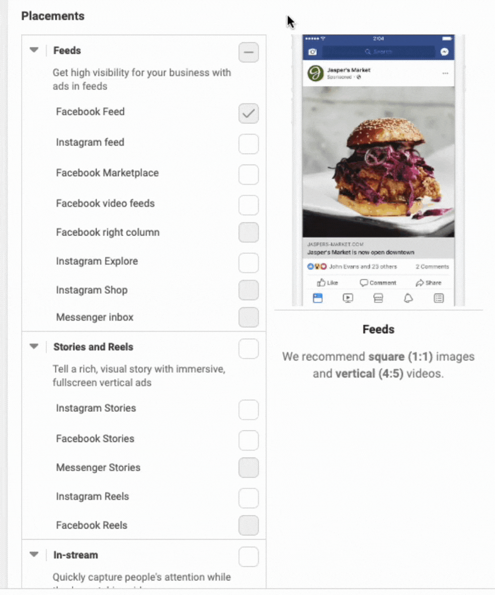 다시 말하지만, 이것은 단지 플랫폼마다의 차이가 아닙니다. 광고 게재위치에 따라 다릅니다. 게재위치별로 권장되는 모든 측면을 쉽게 찾을 수 있습니다(광고를 만드는 동안에도 표시됨). 그러나 다른 게재위치에 대해 다른 크기로 귀찮게 하고 싶지 않다면 콘텐츠에 가장 보편적이고 가장 최적화된 비율은 1:1 또는 4:5 비율이 될 것입니다.