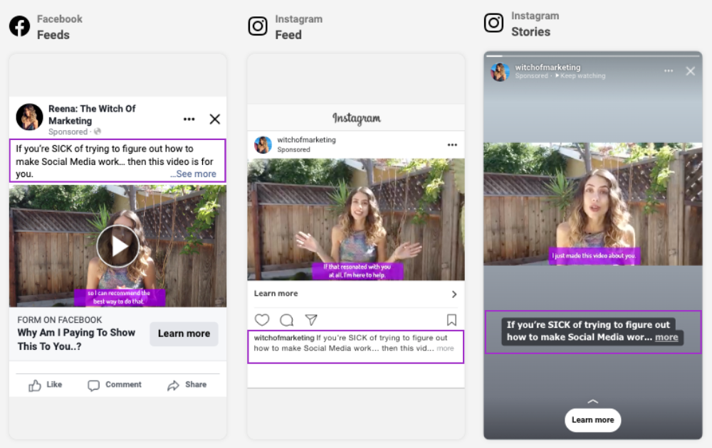 Facebook 뉴스피드에서 기본 텍스트는 버튼과 비디오/이미지 위에 있습니다. Instagram의 뉴스피드에서 버튼과 이미지/비디오 아래에 있습니다. Instagram Stories에서는 동영상 아래에 있지만 버튼 위에 있습니다. 따라서 누군가에게 클릭할 위치를 안내하는 경우 광고 게재위치에 따라 '위의 버튼을 클릭' 또는 '동영상 아래의 '자세히 알아보기' 버튼 클릭'을 작성하여 적절하게 탐색해야 합니다.