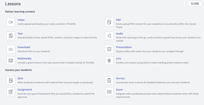 Thinkific은 존재하는 거의 모든 유형의 멀티미디어 콘텐츠를 지원하며 각 레슨 내에서 다양한 유형의 미디어를 사용할 수 있습니다.