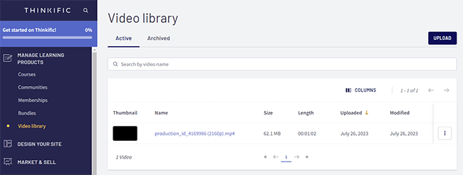 멋진 점은 Thinkific이 모든 요금제에서 기본 비디오 호스팅을 제공한다는 것입니다. 따라서 YouTube 또는 Vimeo와 같은 타사 플랫폼의 동영상을 삽입할 필요가 없습니다. 계정에 직접 업로드한 다음 비디오 라이브러리에서 편집하고 관리할 수 있습니다.