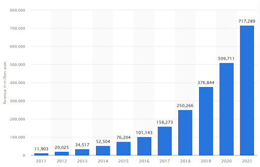 1999년 Jack Ma가 설립한 Alibaba는 세계 최대의 온라인 마켓플레이스 중 하나로 2021년 연간 매출이 1,090억 달러(약 7,173억 위안) 이상입니다.