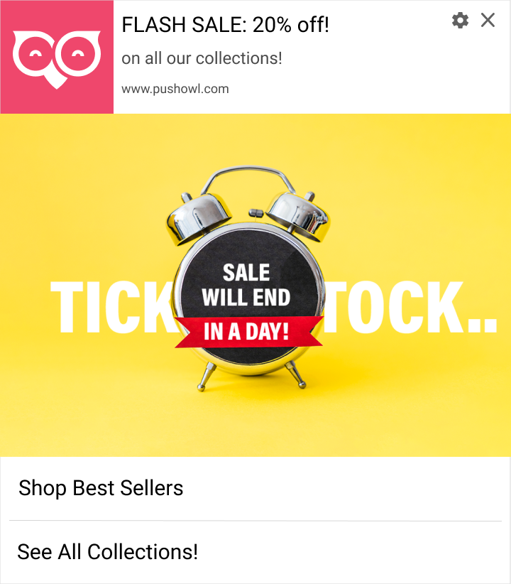 의심의 여지가 없습니다. 쇼핑객은 플래시 판매를 좋아합니다! 만료 날짜가 있는 캠페인은 쇼핑객의 긴급성을 유발하고 거래를 놓치지 않도록 더 빠르게 결제하도록 합니다. 많은 상점에서 주말 판매를 실행하고 Flash Sale 기능을 사용하여 만료 날짜가 있는 푸시 알림을 보냅니다.