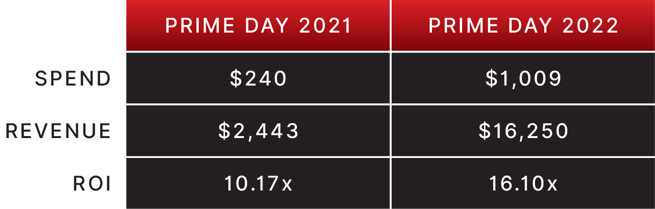 이 고객은 아마존에서 비즈니스를 구축했으며 관련 트래픽과 증가된 구매 의향을 활용하기 위해 7월 대부분 기간 동안 세일을 진행했습니다. Amazon 전문가가 이 계정에 합류했을 때 그들은 몇 가지 새로운 캠페인을 시작하여 지출을 크게 늘리는 Prime Day 전략을 수립하여 7월 내내 높고 일관된 판매를 달성했으며 2021년과 2022년 Prime Day 판매를 비교하여 수익이 146% 증가했습니다.