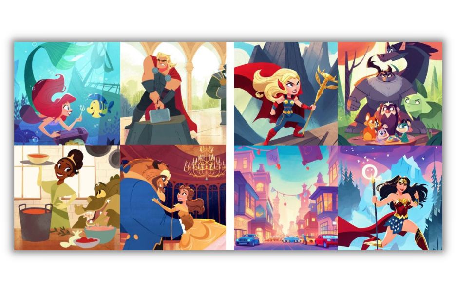 Podpis: zbiór ilustracji artystki Hollie Mengert (po lewej) w porównaniu z ilustracjami wygenerowanymi przez sztuczną inteligencję na podstawie jej stylu, których kuratorem jest Andy Baio .