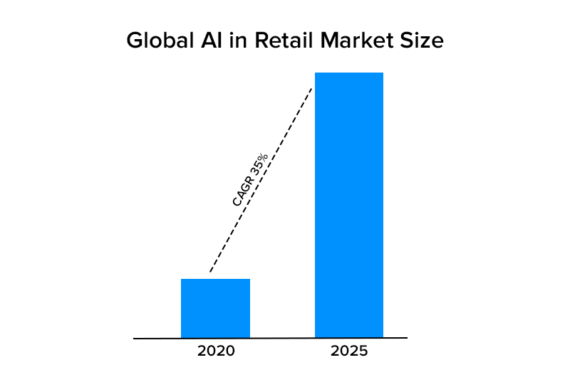 Wielkość globalnego rynku AI, tj. Przewiduje się, że sztuczna inteligencja w wielkości rynku detalicznego i e-commerce wzrośnie w CAGR na poziomie 42,8% w okresie prognozy 2019-2025 i uzyska przychód w wysokości 19,37 miliarda dolarów do roku 2025.