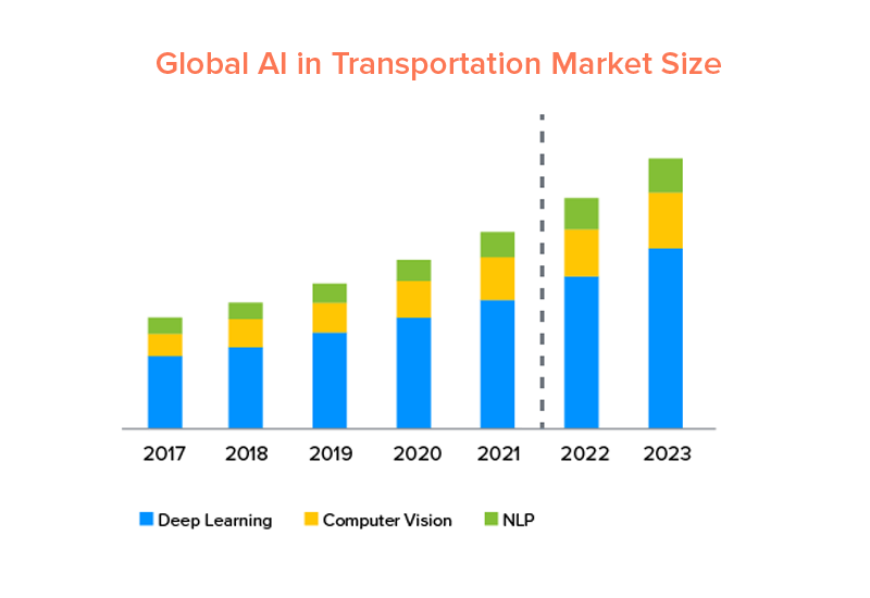 Technologia autonomicznej jazdy zwiększy wielkość rynku AI z 54 miliardów dolarów w 2019 r. do 556 miliardów dolarów do 2026 r., przy 39% CAGR, jak wynika z raportu Allied Market Research . Ponadto szacuje się, że do roku 2025 sztuczna inteligencja w transporcie przyniesie 173 miliardy dolarów oszczędności w całym łańcuchu dostaw OEM dla branży motoryzacyjnej.