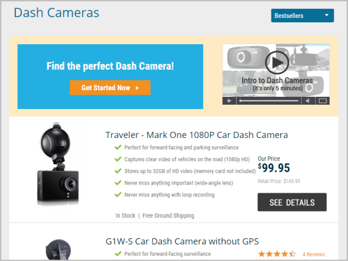 SpyTec, sprzedawca produktów do monitoringu, oferuje wyszukiwarkę produktów na głównych stronach dla każdej z najważniejszych kategorii produktów. Oto przykład punktu wejścia wyszukiwarki dla kategorii „kamery samochodowe”.