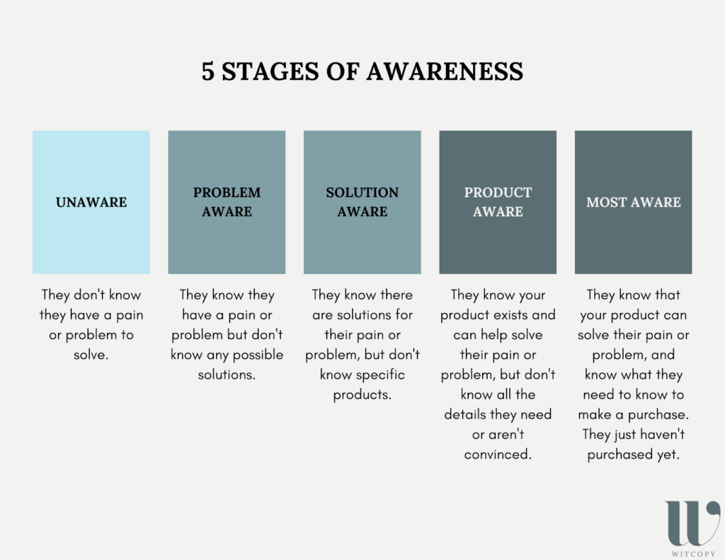 Jeśli chodzi o kopię strony sprzedażowej, chcesz wybrać odpowiednie ramy zgodnie ze stopniem świadomości odbiorców (ile wiedzą o swoim problemie i Twoim rozwiązaniu) oraz wyrafinowaniem rynku (ile wiedzą o Twoim rynku).