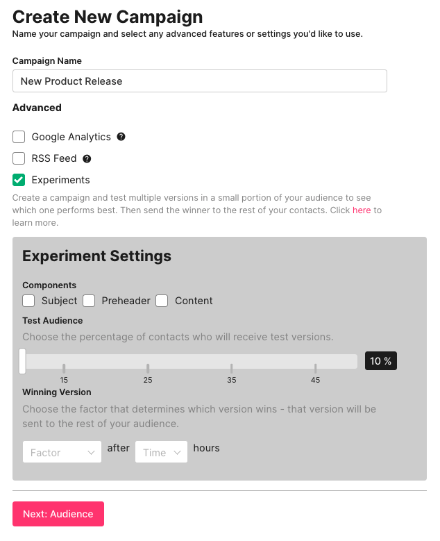 Możesz włączyć tę funkcję dla dowolnej kampanii (lub automatyzacji), którą tworzysz w Sendlane. Po wybraniu opcji tworzenia nowej kampanii wystarczy zaznaczyć pole Eksperymenty , aby wyświetlić rozszerzony widok ustawień eksperymentu.