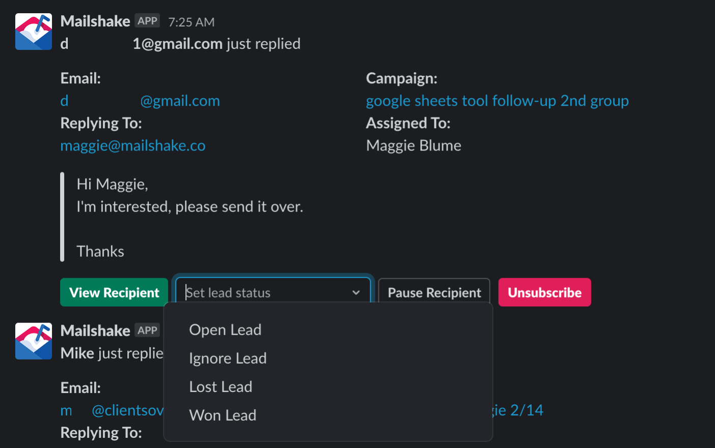 Istnieje również natywna integracja Slacka z Mailshake, jeśli chcesz połączyć go z kampaniami typu cold outreach.