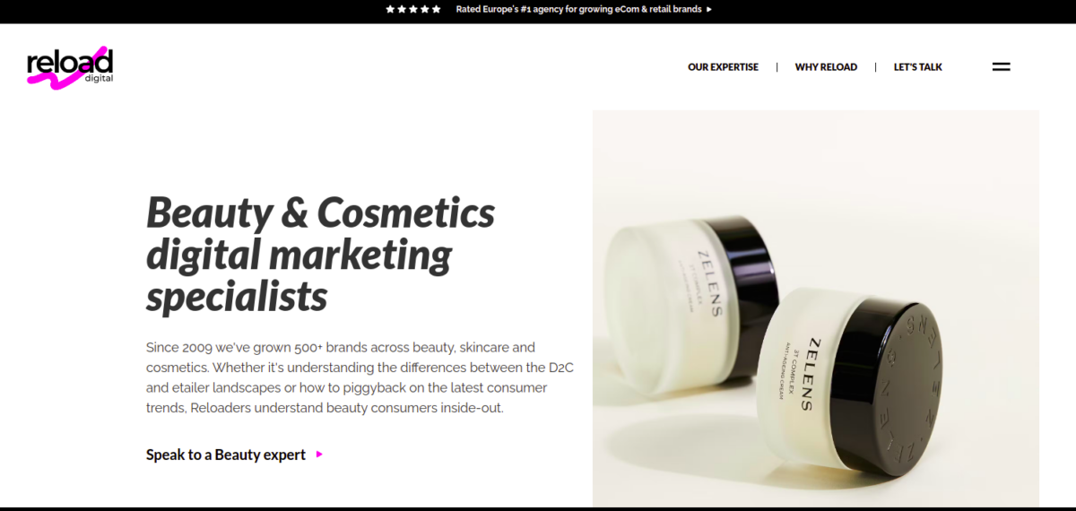 Następna na naszej liście jest Reload, przyszłościowa agencja cyfrowa zajmująca się marketingiem kosmetyków, znana ze swojej wiedzy specjalistycznej w tworzeniu niestandardowych strategii marketingowych dla marek kosmetycznych. Ich zespół specjalistów stara się zrozumieć wyjątkowe wyzwania i cele Twojej marki, zapewniając zgodność Twoich działań marketingowych z ogólną wizją.