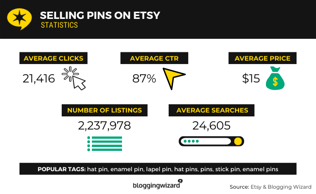 Na Etsy jest ponad 2,2 miliona ofert z pinami. Większość dotyczy szpilek emaliowanych, które sprzedawcy Etsy tworzą przy użyciu niestandardowych projektów.