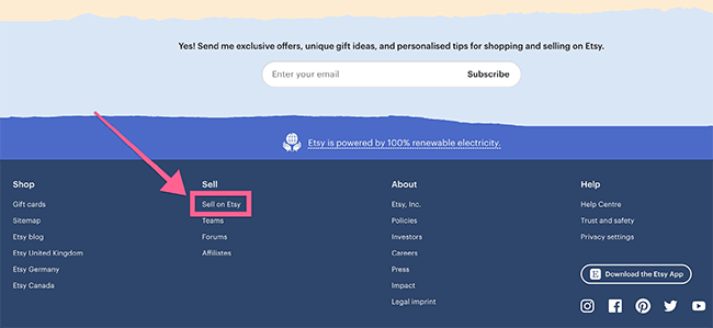 Aby zostać sprzedawcą Etsy, musisz udać się na Etsy, przewinąć w dół i kliknąć „Sprzedaj na Etsy”.
