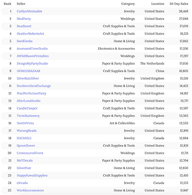 Według Marketplace Pulse na dzień 11 sierpnia 2022 r. najlepsi sprzedawcy Etsy mają siedzibę w Stanach Zjednoczonych, dominując w pierwszych 7 pozycjach.