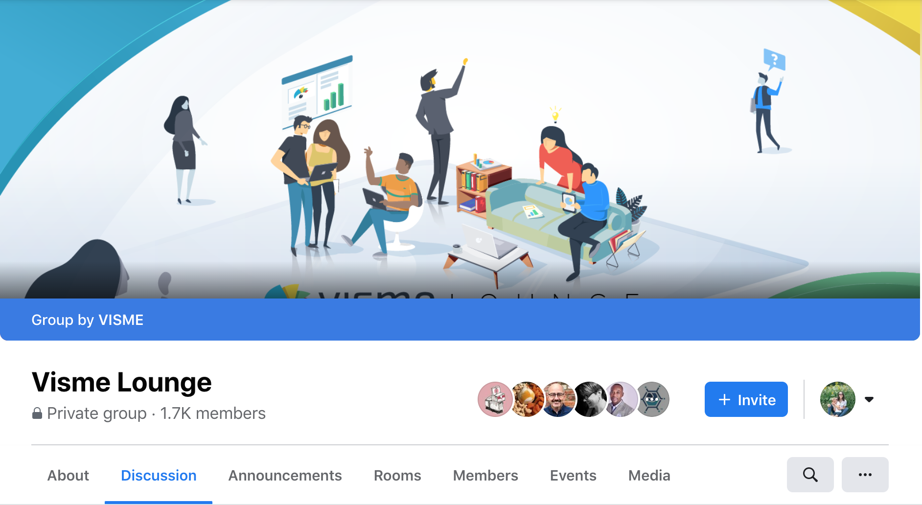 Zobacz przykład poniżej z oprogramowania do projektowania graficznego Visme. Stworzyli grupę na Facebooku o nazwie The Visme Lounge, w której najbardziej lojalni i zaangażowani użytkownicy dzielą się swoimi projektami i zbierają pomysły.