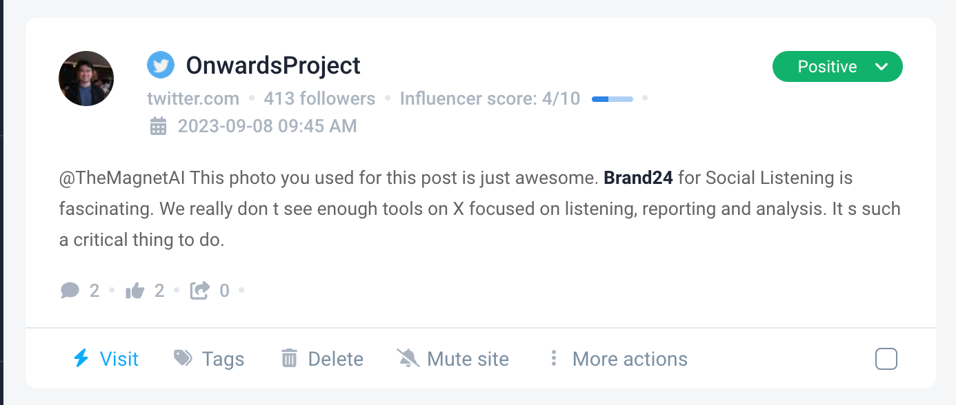Brand24 to narzędzie do słuchania społecznościowego oparte na sztucznej inteligencji i potężne narzędzie do ulepszania strategii zarządzania reputacją firmy. Możesz go używać do monitorowania wzmianek o marce i recenzji online, konfigurowania alertów dotyczących słów kluczowych, przeprowadzania analizy nastrojów i wielu innych.
