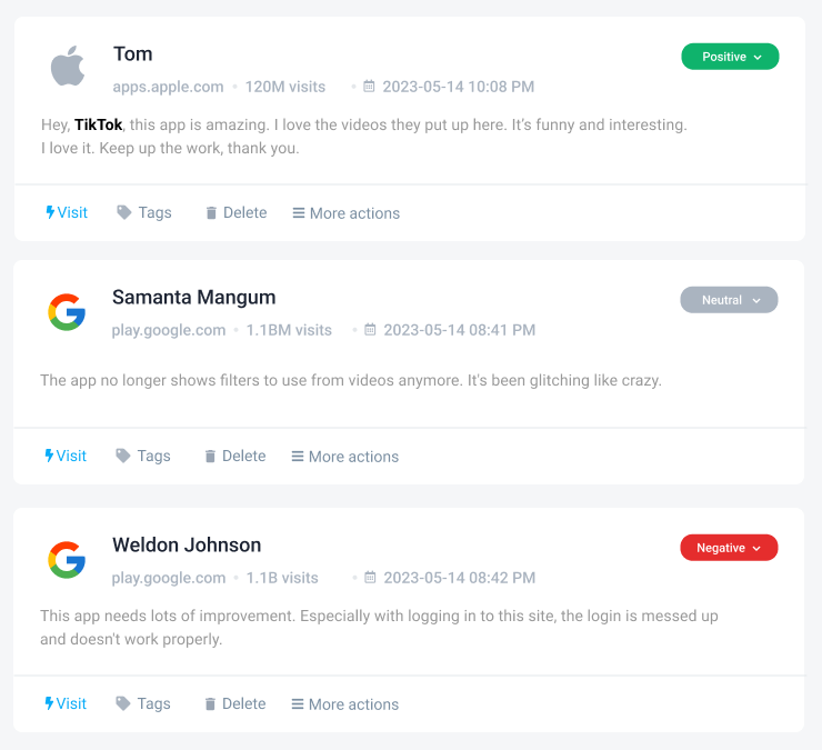W widoku projektu możesz filtrować wzmianki według pozytywnych, negatywnych lub neutralnych nastrojów. Aby utrzymać dobrą reputację swojej firmy, regularnie sprawdzaj negatywne opinie i staraj się poprawić jakość obsługi klientów, rozwiązując wszelkie problemy, jakie mogą mieć.