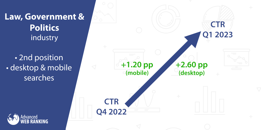 Nadszedł czas, aby zwrócić naszą uwagę na branżę o najwyższym wzroście współczynnika klikalności dla pojedynczego stanowiska: prawo, administracja i polityka . Zmiany nie dotknęły witryn , które uplasowały się na pierwszej pozycji, natomiast te, które znalazły się na drugiej pozycji , odnotowały imponujący wzrost CTR o 2,60 pp na urządzeniach stacjonarnych i 1,20 pp na urządzeniach mobilnych . Jednocześnie ogólny popyt na wyszukiwanie w branży odnotował stały wzrost o +35,57%.