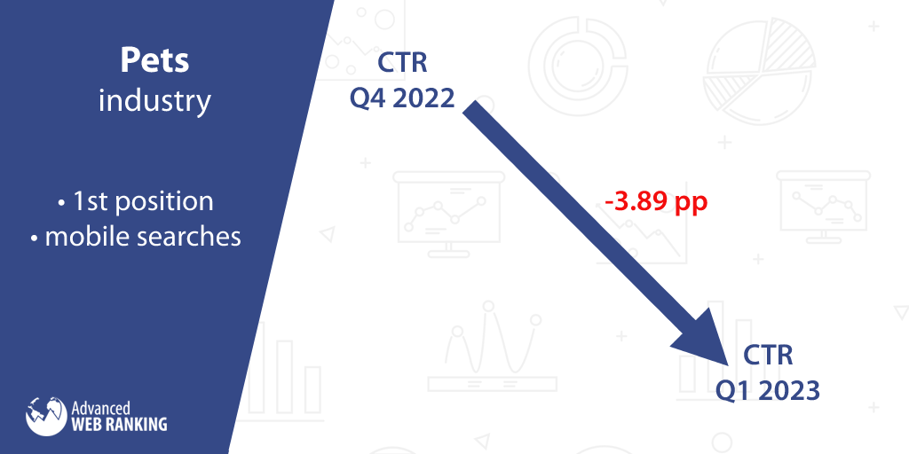 A teraz przejdźmy do branży z największym spadkiem współczynnika klikalności dla pojedynczej pozycji: Pets . Tutaj CTR dla witryn zajmujących pierwsze miejsca w zapytaniach z urządzeń mobilnych spadł średnio o 3,89 pp .