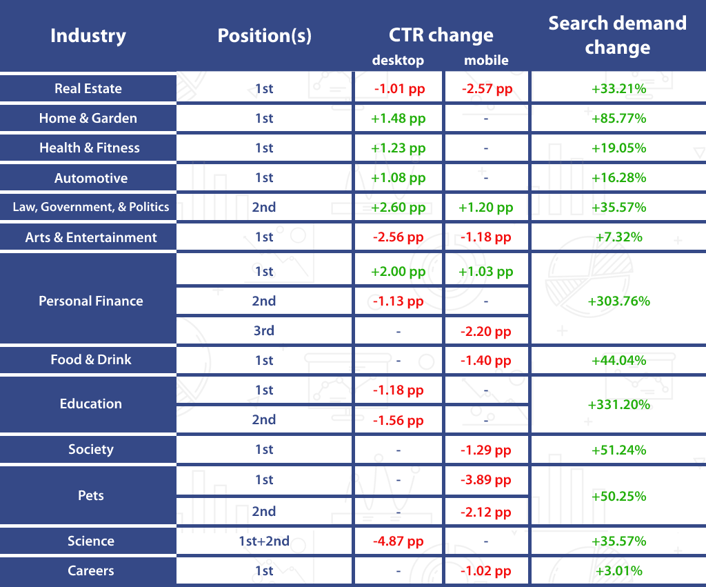 Jak być może już wiesz, powiążemy różnice w CTR ze zmianami w popycie na wyszukiwanie. Naszym celem jest zidentyfikowanie przyczyn potencjalnych wahań ruchu dla każdej branży, gdy rankingi pozostają stabilne.