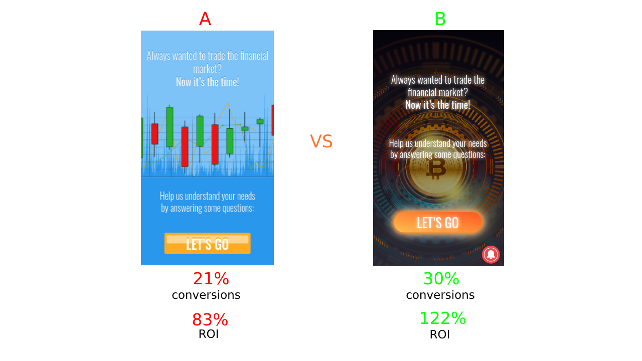 Początkowo zaczęli testować standardową stronę docelową z niebieskim tłem (A), która miała 21% współczynnika konwersji i generowała ROI na poziomie 83%. Przeszli na ciemne tło, które było bardziej związane z ich ofertą Crypto. Ta zmiana sprawiła, że czas i szybkość reakcji były znacznie szybsze niż w przypadku pierwszego LP. Jak można wyliczyć, ten test A/B pomógł firmie Adavice w zwiększeniu osobistego zwrotu z inwestycji o 47%.