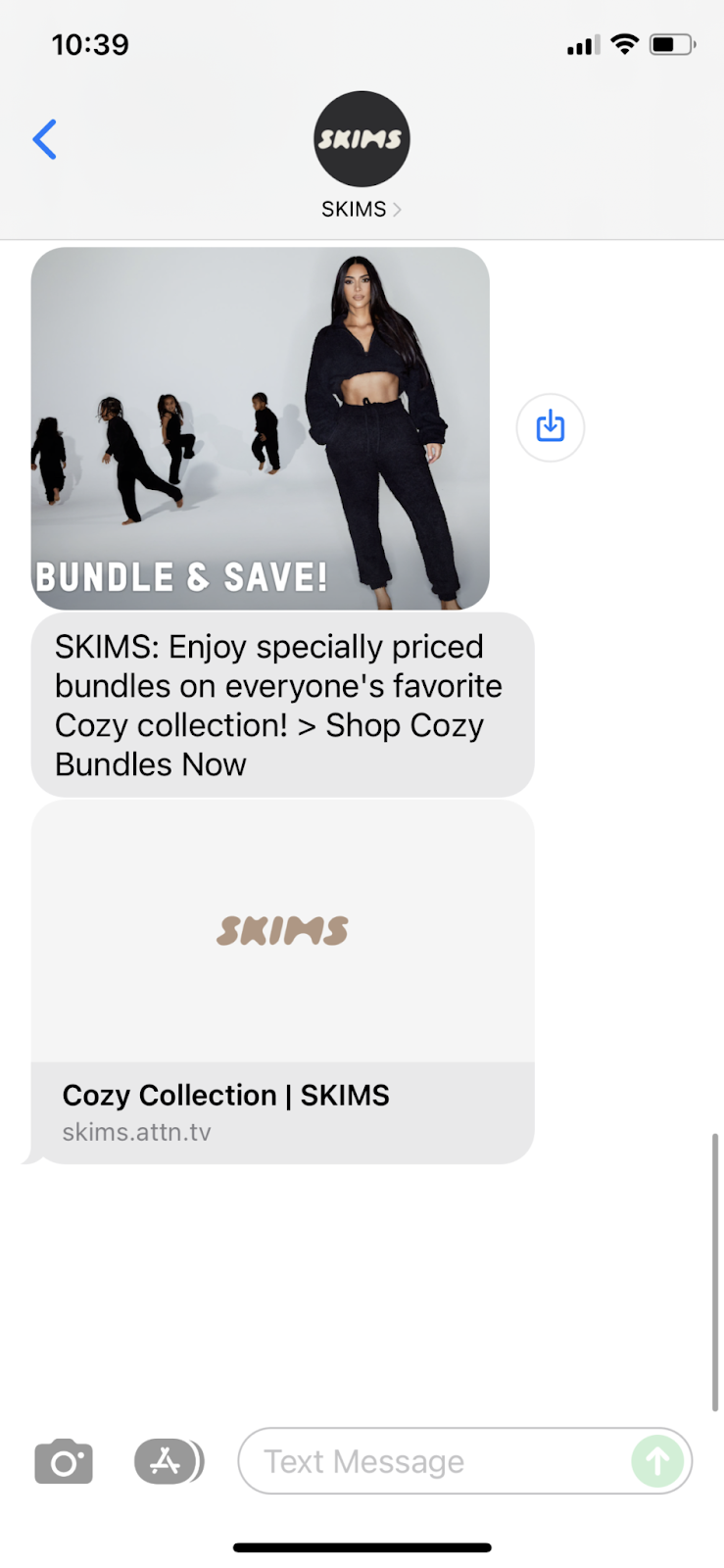 To idealna mieszanka. Przyciągające wzrok obrazy nie tylko prezentują produkt, ale także wzmacniają wezwanie do działania przekazu: kup pakiet i zaoszczędź trochę gotówki. Jest nawet klikalny link, który przeniesie klienta bezpośrednio do strony głównej SKIMS, gdzie może natychmiast kupować pakiety.