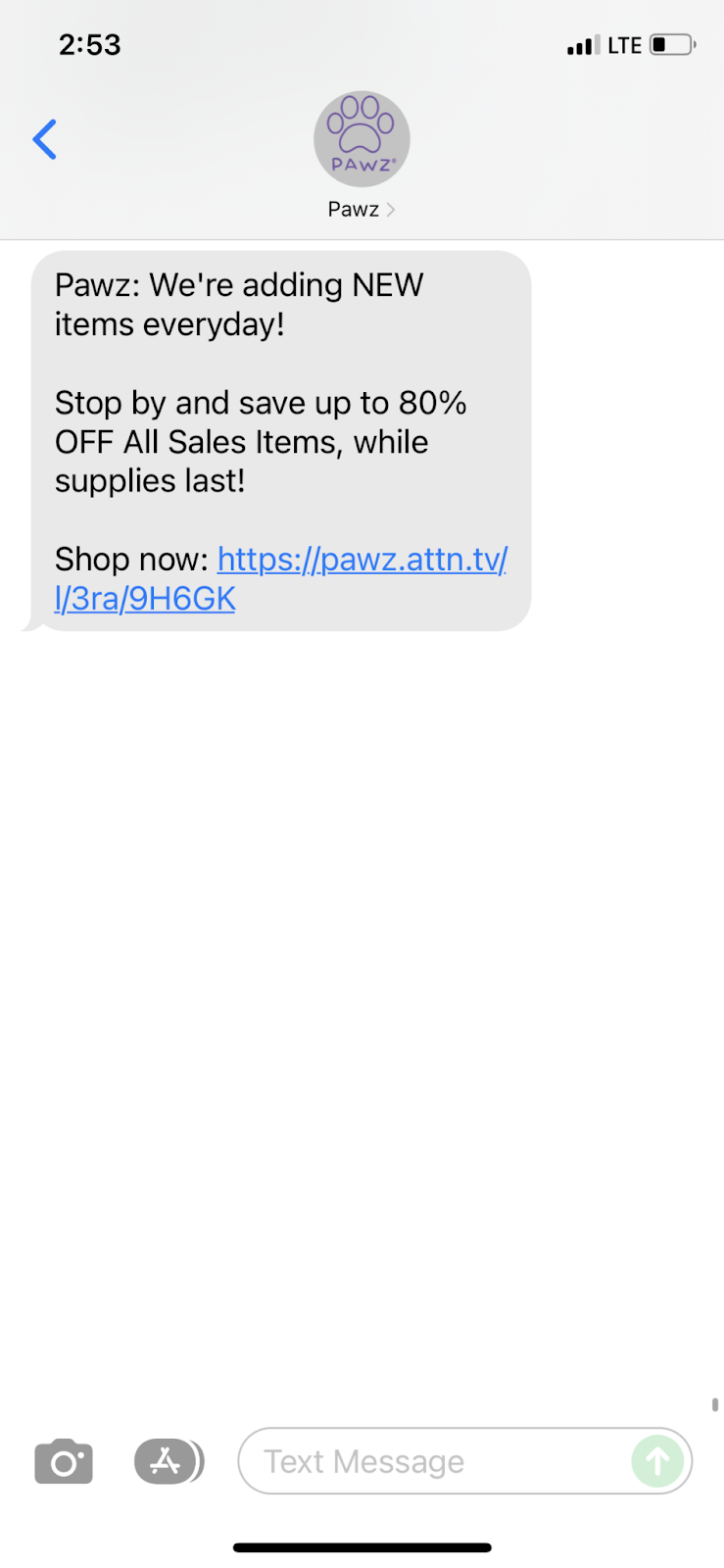 Wiadomość reklamuje wyprzedaż, którą prowadzi Pawz, ale nadal udaje mu się utrzymać poniżej limitu 160 znaków za pomocą skróconego, klikalnego linku. Pawz może śledzić, ile osób kliknęło w link, aby śledzić sukces sprzedaży i wygenerowany przychód!