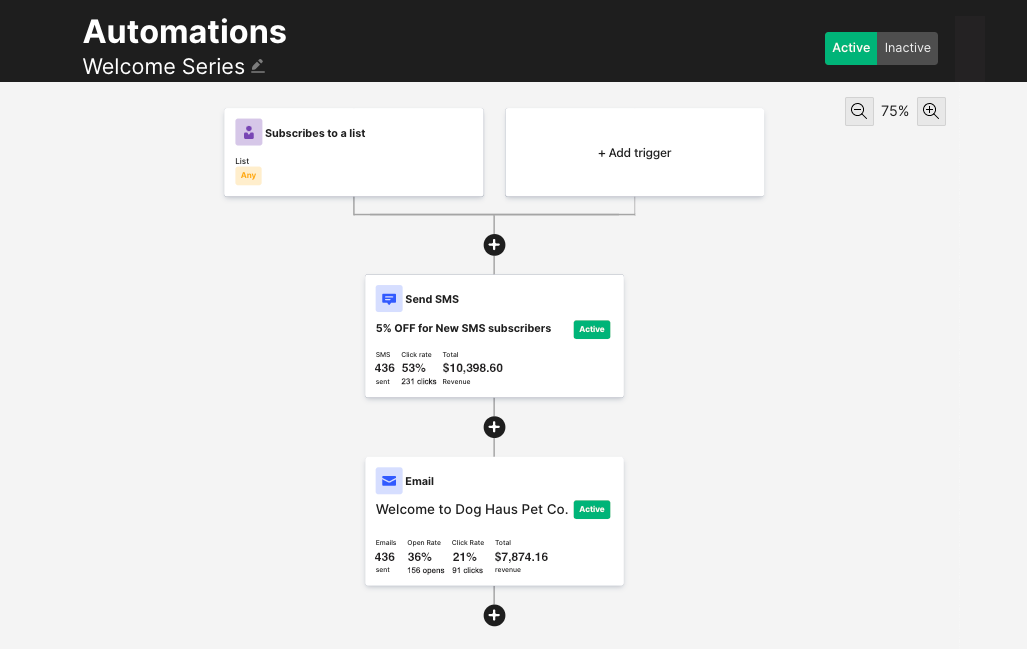 Zautomatyzowane sekwencje umożliwiają wprowadzanie nowych klientów, utrzymywanie ich zaangażowania w Twoją markę i powiadomienia push, aby pomóc odzyskać porzucone koszyki. Ponieważ te automatyzacje wykorzystują określone wyzwalacze, gdy klient kliknie łącze SMS lub otworzy wiadomość, uruchomi to kolejną część przepływu pracy.