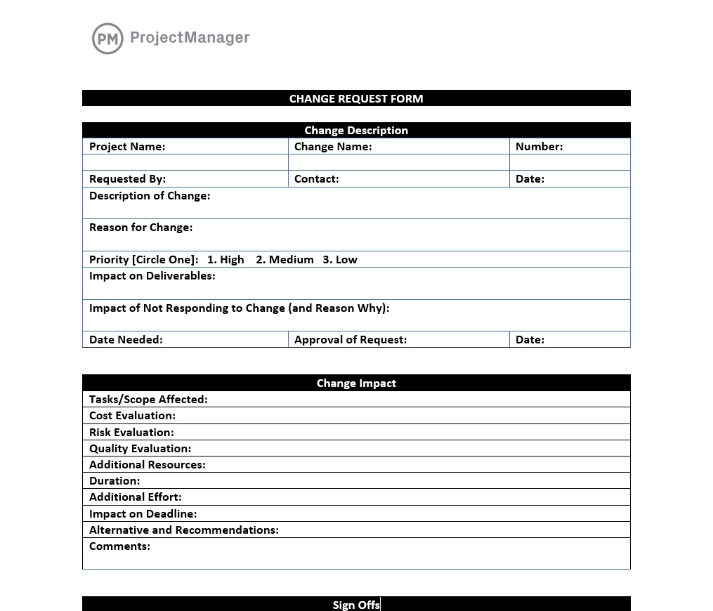 Możesz dostosować formularz prośby o zmianę, aby zawierał tyle lub tyle szczegółów, ile chcesz. Uwzględniliśmy miejsce na krótki opis i wpływ, jaki będzie to miało na projekt. W formularzu jest wystarczająco dużo informacji, aby kierownicy projektów mogli współpracować z PMO przy podejmowaniu decyzji, czy zmiana jest warta wprowadzenia, a jeśli tak, to w jaki sposób, czy też nie podejmować żadnych działań.